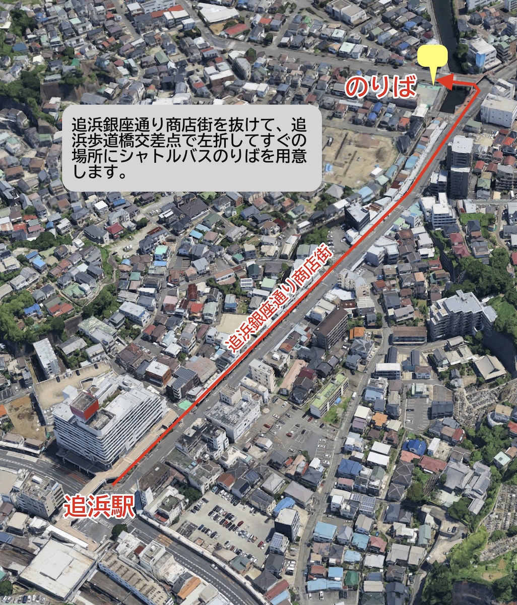 追浜駅から海側へ向かって徒歩約10分。歩道橋のある大きな交差点を少し横に入ったところにシャトルバスのりばを用意いたします。