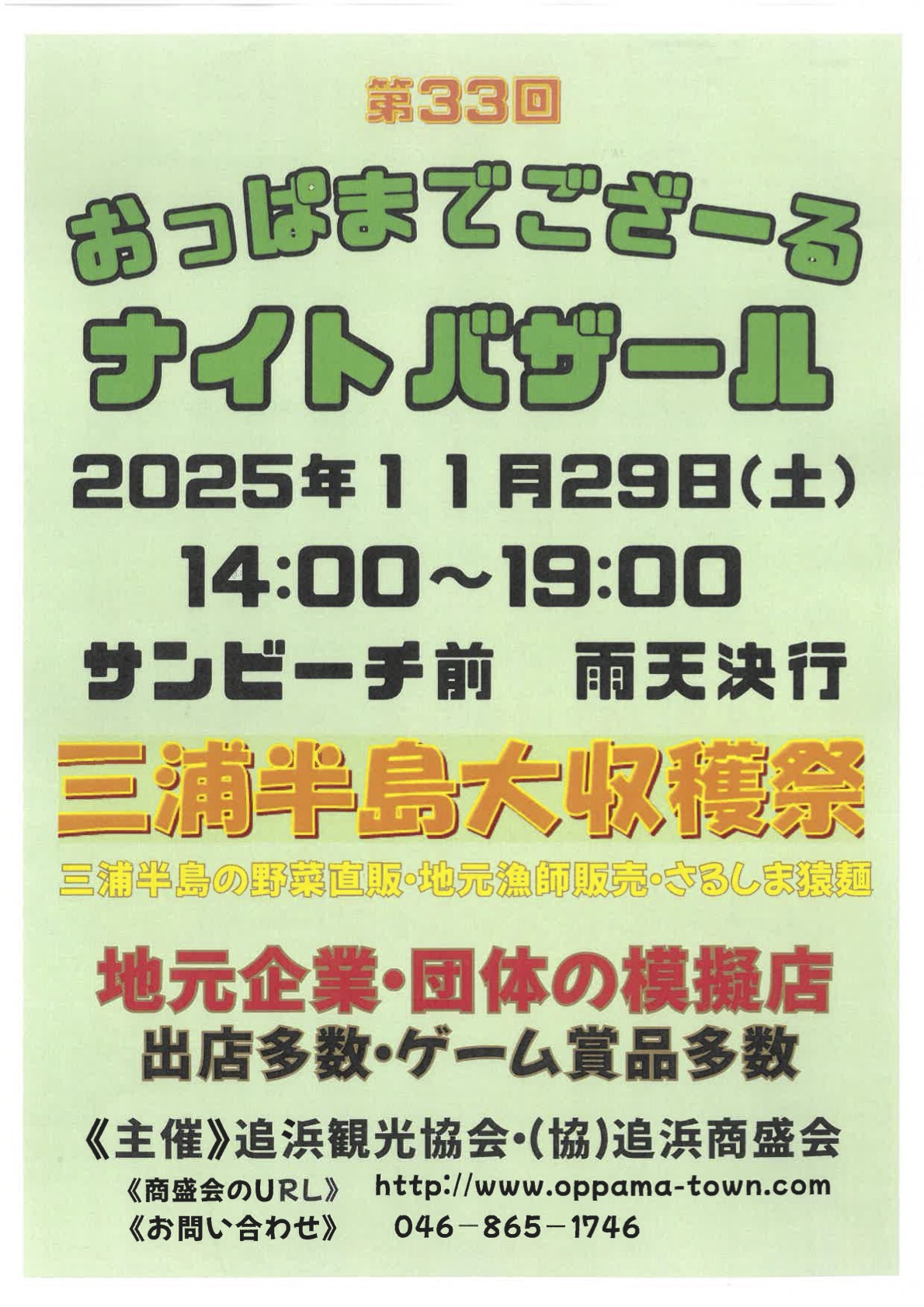 ナイトバザール 投稿日時: 2025年10月31日 投稿者: admin 第33回ナイトバザール おっぱまでござ〜る 年末恒例のナイトバザールが今年も開催です。 日時:2024年11月29日(土)14:00〜19:00場所:サンビーチ前(雨天決行)三浦半島の美味しい素材を生産者が直売する「三浦半島大収穫祭」のほか、地元企業や地域団体による模擬店も並びます。 関連