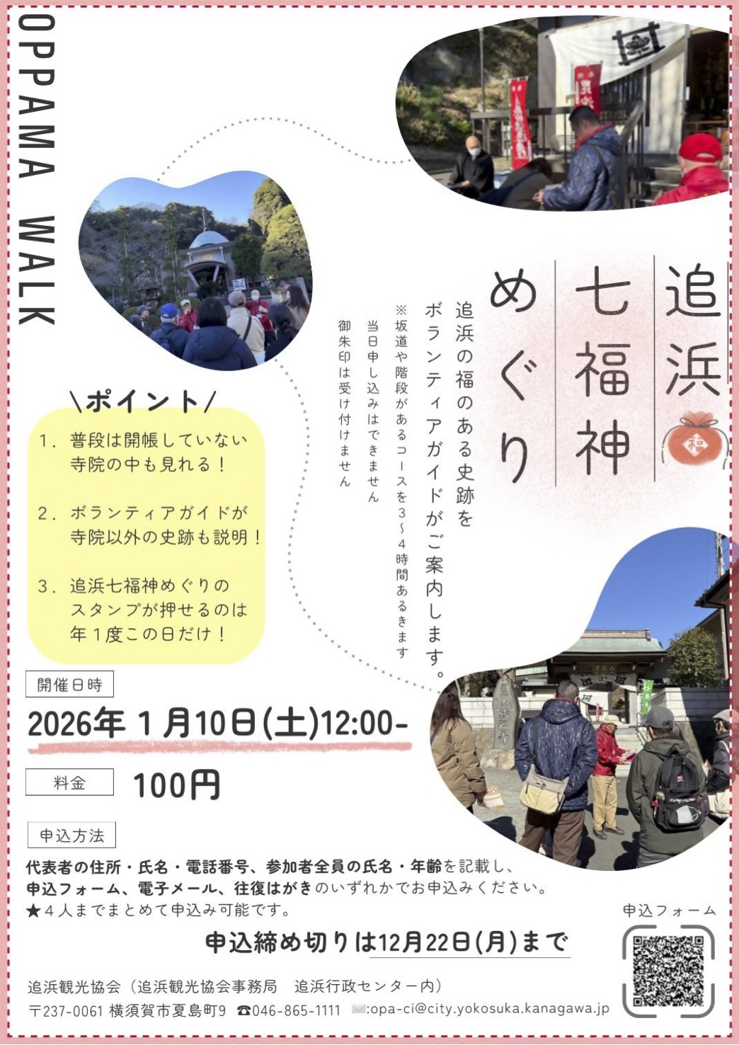 追浜地域散策・追浜七福神めぐり [事前申込制] 投稿日時: 2025年11月21日 投稿者: admin 毎年ご好評いただいてます追浜七福神めぐりを開催いたします。 日程:2026年1月10日(土) 12時出発 追浜の風景とともに追浜の“福”のある文化史跡を、ボランティアガイドによる案内でお楽しみいただける人気のイベントです。 事前申込制になっていますので、詳しくは下記のページをご覧ください。 追浜地域散策・追浜七福神めぐり 関連